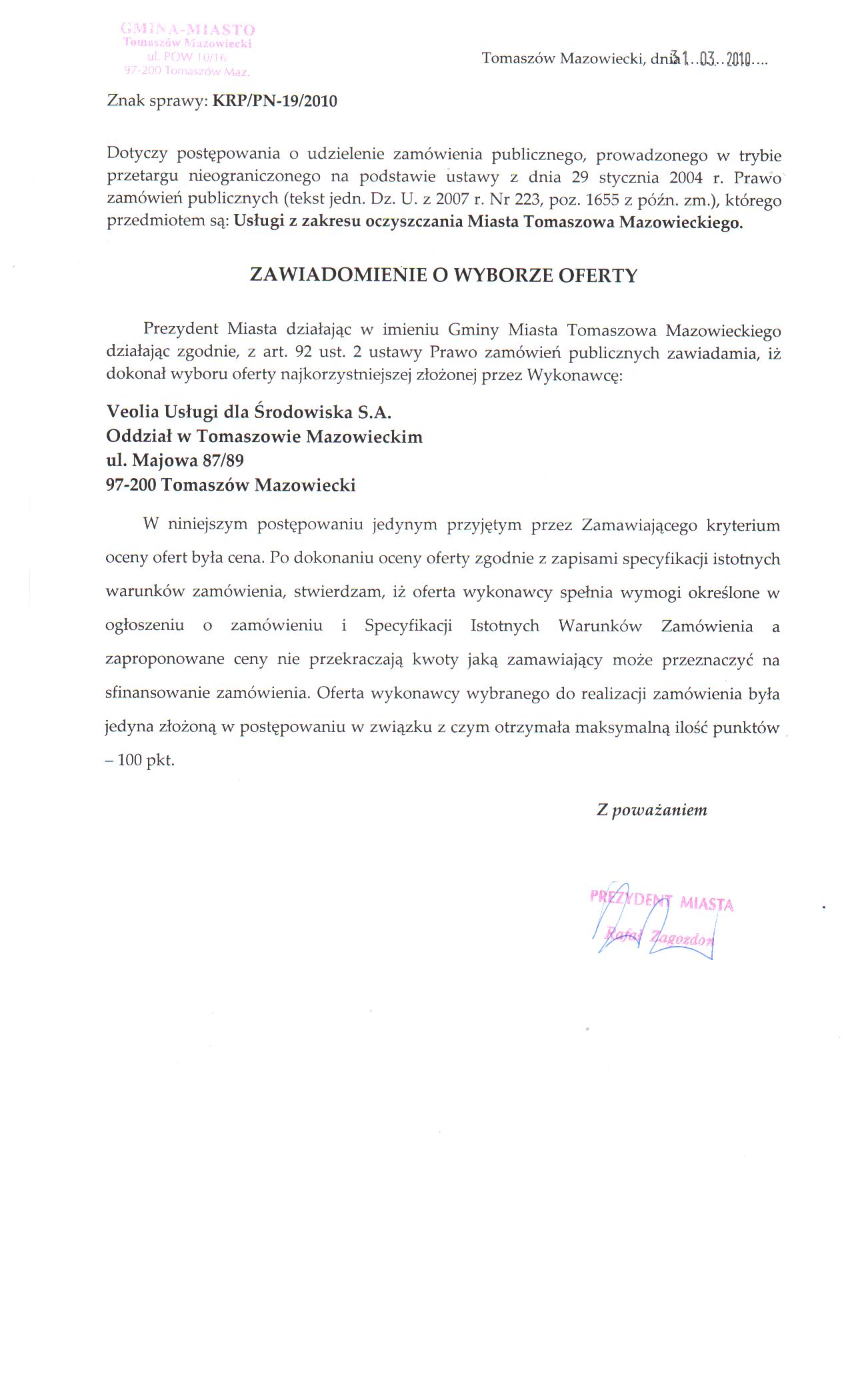 Zawiadomienie o wyborze - PN-76 - OCZYSZCZANIE MIASTA ZADANIE I