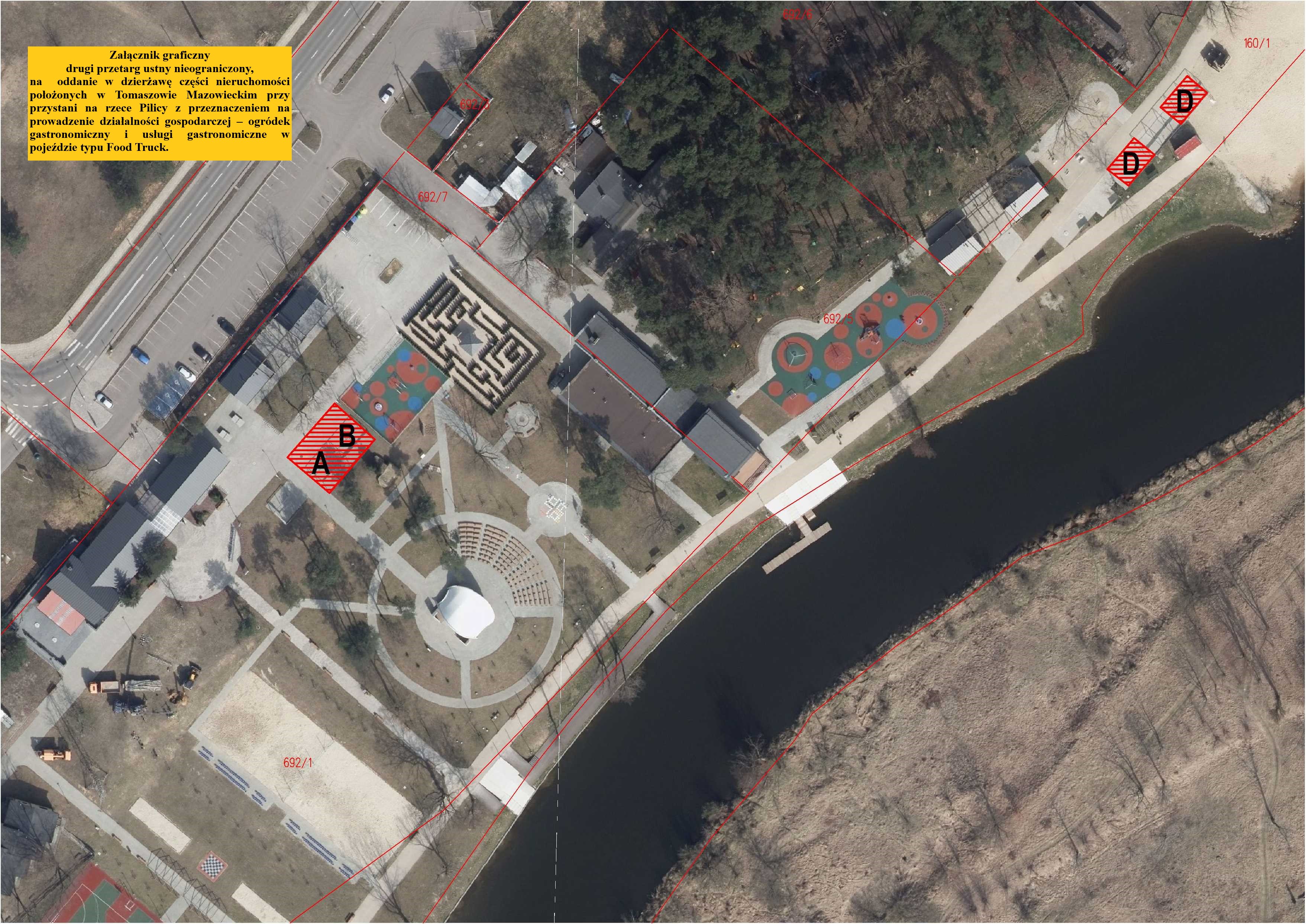Ogłoszenie i regulamin II przetargu ustnego nieograniczonego, załączniki mapowy na oddanie w dzierżawę części nieruchomości położonych w Tomaszowie Mazowieckim przy przystani na rzece Pilicy z przeznaczeniem na prowadzenie działalności gospodarczej - ogródek gastronomiczny i usługi gastronomiczne w pojeździe typu Food Truck.