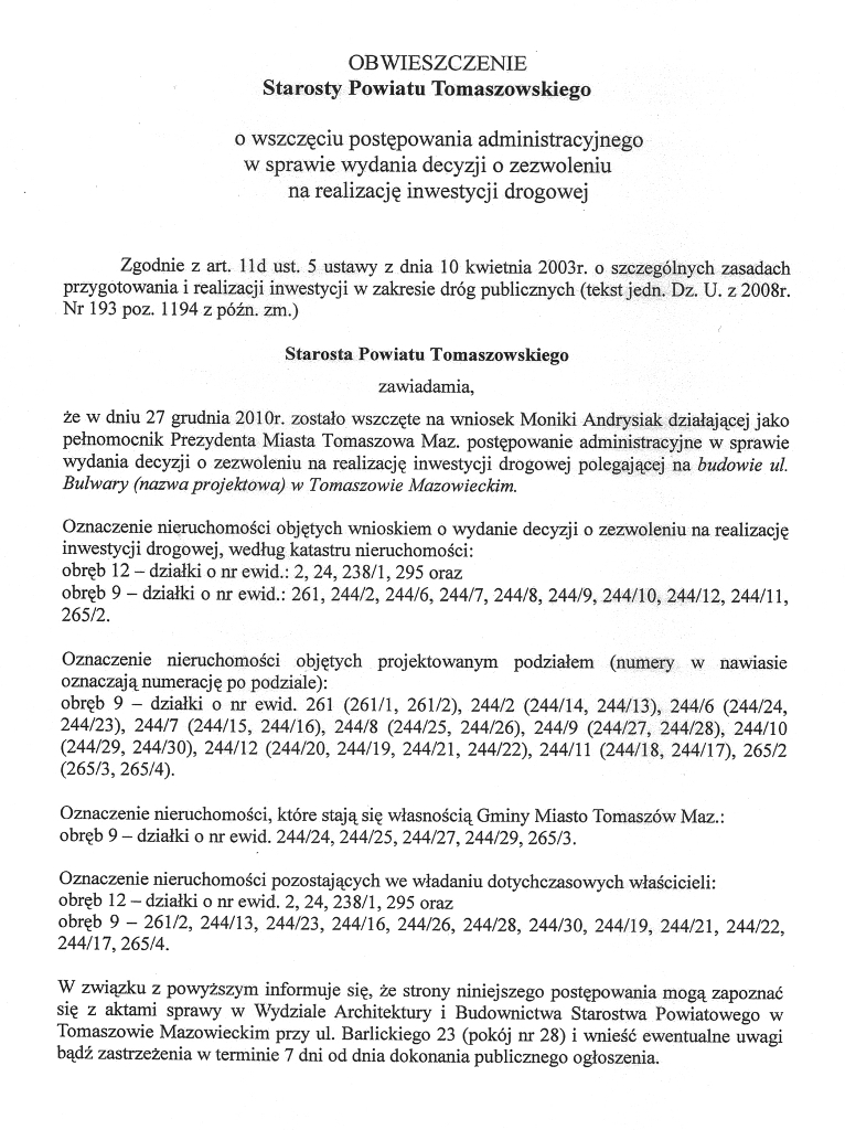 Obwieszczenie: Starosta Powiatu Tomaszowskiego zawiadamia, że w dniu 27.12.2010r. zostało wszczęte na wniosek Moniki Andrysiak działającej jako peinomocnik Prezydenta Miasta Tomaszowa Maz. postępowanie administracyjne w sprawie wydania decyzji o zezwoleniu na realizację inwestycji drogowej polegającej na budowie ul. Bulwary (nazwa projektowa) w Tomaszowie Mazowieckim.