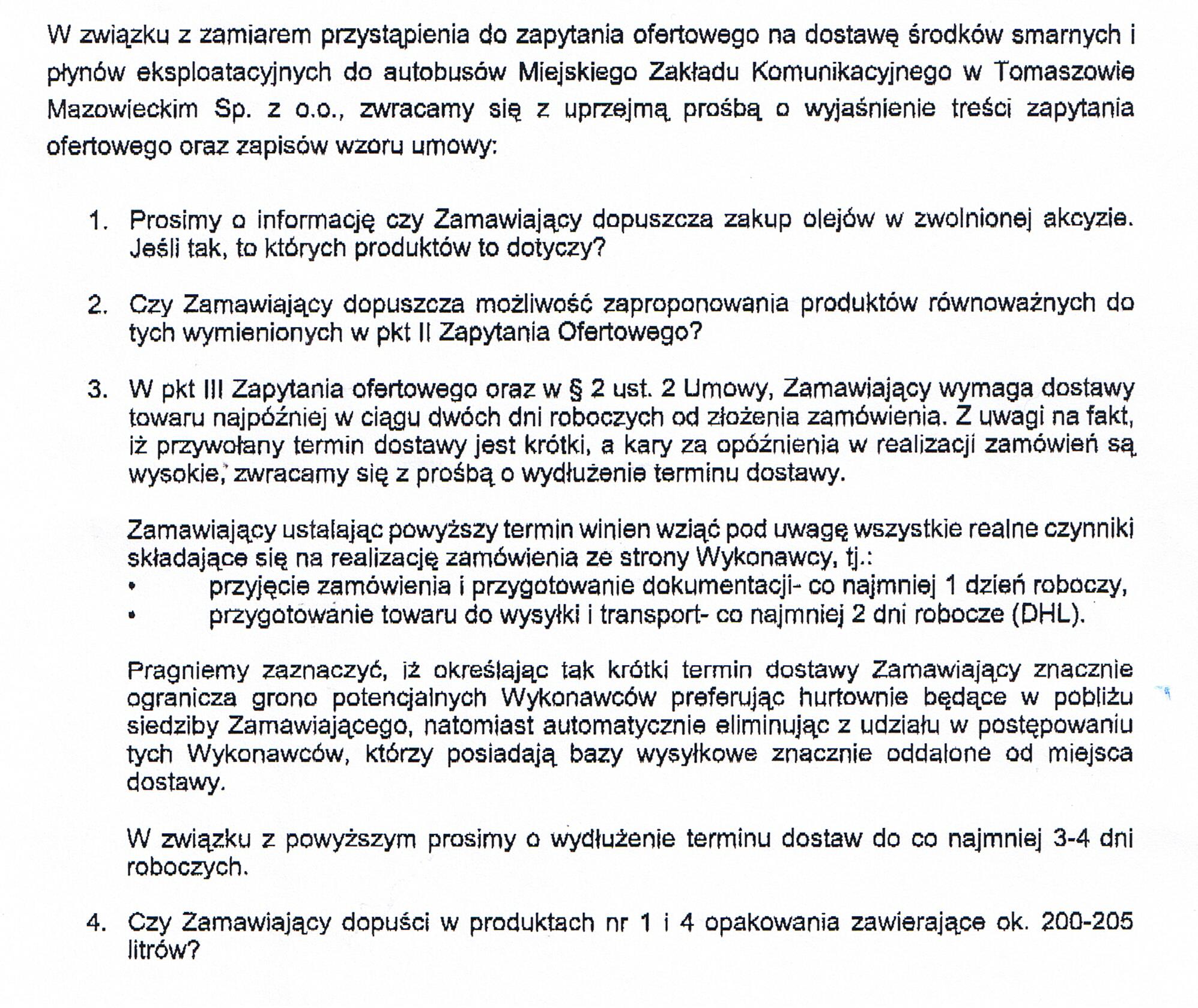 Zapytanie ofertowe na dostawę środków smarnych i płynów eksploatacyjnych do autobusów Miejskiego Zakładu Komunikacyjnego w Tomaszowie Mazowieckim Sp. z o. o.