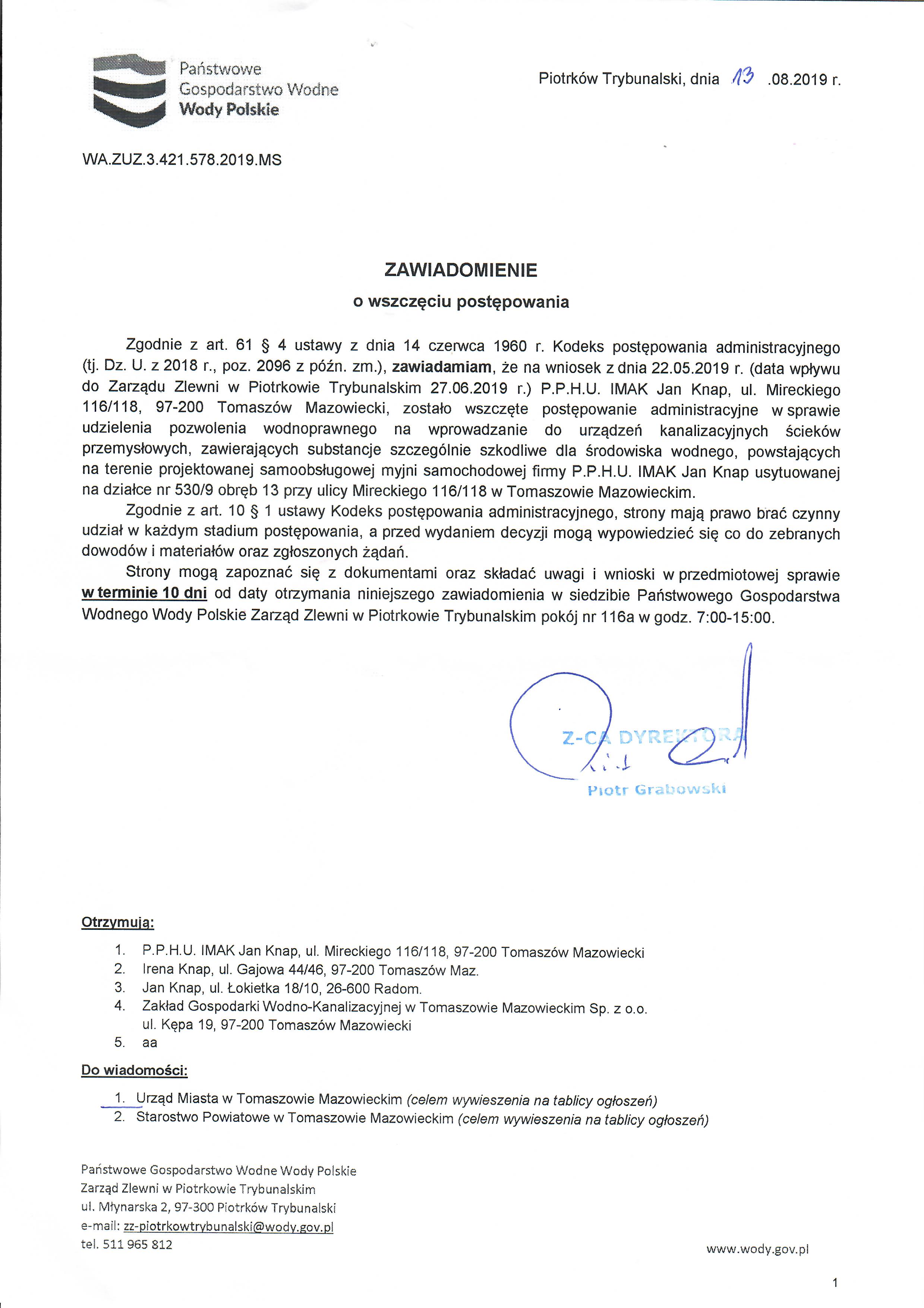 Państwowe Gospodarstwo Wodne Wody Polskie - Zawiadomienie o wszcęściu postępowania 31-10-2019 WA.ZUZ.3.421.776.2019.MK